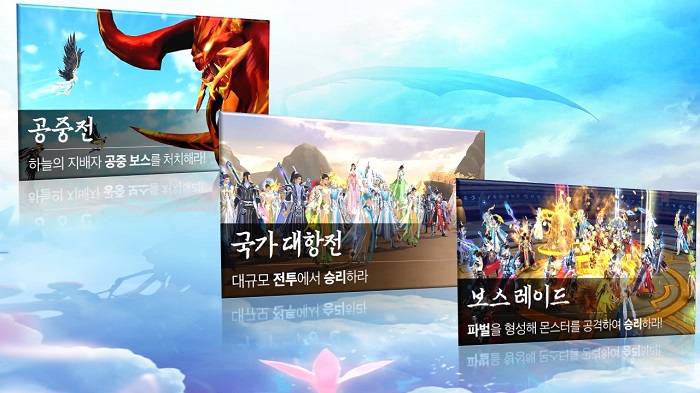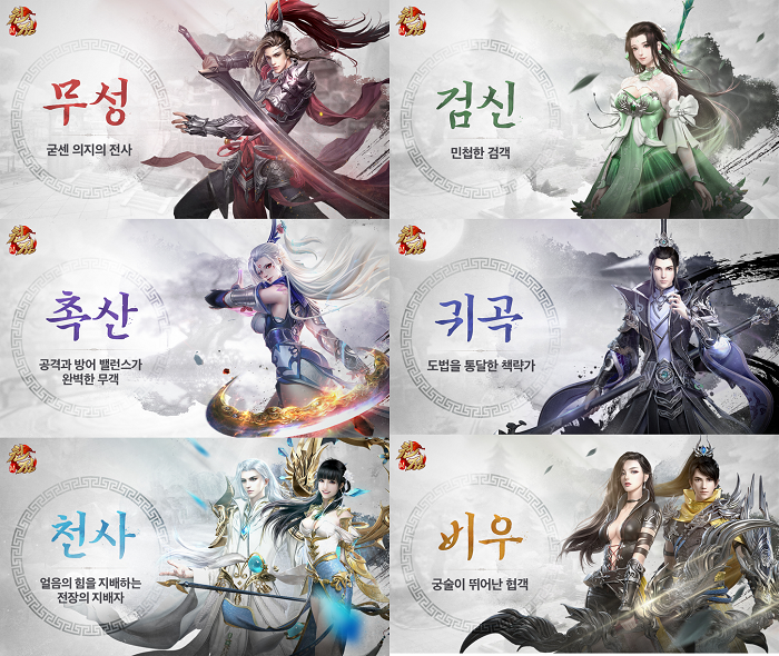 무성, 검신, 촉산, 귀곡, 천사, 비우 6가지의 무협 속 주인공을 플레이 할 수 있으며 각자의 개성이 뚜렷하여 어디서도 경험하지 못했던 스킬을 볼 수 있다.