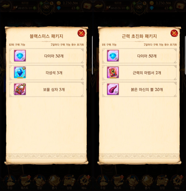 - 초진화 패키지 : ★6 근력/체력/속력 마법서 2개, 붉은 마신의 뿔 20개, 다이아 50개