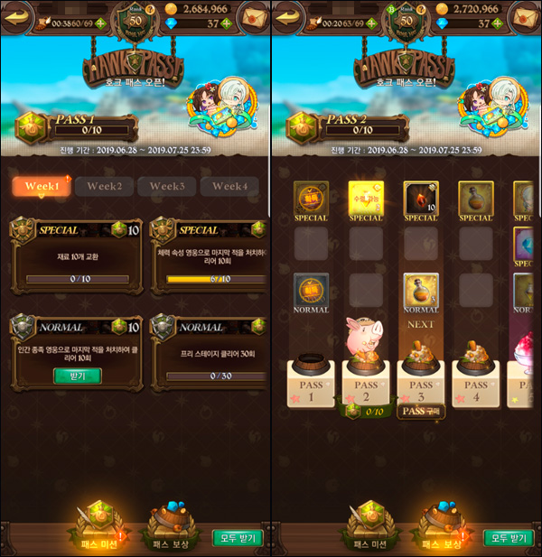 호크패스 이벤트는 기본적으로 미션을 클리어해 얻는 포인트만큼 패스를 이동해 해당하는 아이템을 얻을 수 있는 이벤트다. 기본적으로 받는 보상 외 9900원, 30000원 패키지를 구입하면 스페셜 보상도 획득할 수 있다. 기본적으로 스페셜 보상의 종류가 상당히 좋은 편이니, 여유가 된다면 9900원 패키지 구입 후 진행하는 것을 추천.