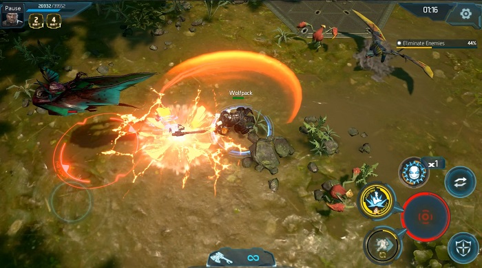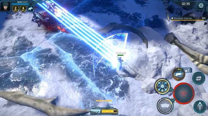 손원호 CD : '헬다이버즈'처럼 전 스테이지에서 전 방향을 활용할 수 있게 디자인했다. 몇몇 보스 스테이지에서는 좀 더 슈팅 액션 게임의 느낌을 줄 수 있게 보스가 위쪽 방향에서 탄막을 쏘는 형태로 디자인했다. 헬다이버즈'의 이야기가 많이 나왔는데, '헬다이버즈'의 게임성을 계승한 것은 결코 아니며, SF 슈팅 게임 장르적인 특성에서 아이디어를 얻었다. 그리고 모바일로 슈팅 액션 게임을 구현하는 과정에서 타게팅 부분은 자동화, 스마트하게 적용했다든지, 총알을 보고 피하면서 안전한 위치에서 원거리 무기로 공략하는 슈팅 본연의 재미를 회피 중심으로 살렸다.