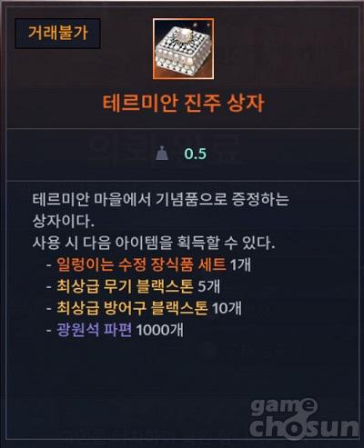 일일 의뢰는 이벤트 NPC 세라로부터 하루에 1회 수락 가능한데, 의뢰는 미니 게임 1종을 클리어하는 것이 목표다. 일일 의뢰를 완료할 때마다 '테르미안 진주 상자' 획득이 가능한데, 해당 상자를 개봉할 시에는 일렁이는 수정 장식품 세트 1개, 최상급 무기 블랙스톤 5개, 최상급 방어구 블랙스톤 10개, 광원석 파편 1000개가 주어진다.