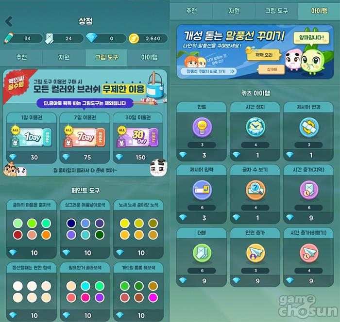 자원 외 페인트 도구와 퀴즈 도우미 아이템 등을 구매할 수 있다. = 게임조선 촬영