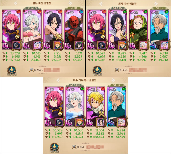 섬멸전은 정형화되어 있다보니 다른 유저들과 비슷한 수준이다. 붉은마신은 '코인 고서 + 이동주점 엘리자베스 + 코인 멀린 (서브 고르기우스)' 회색마신은 '코인 고서 + 코인 멀린 or 왕녀 or 버프 길선더 + 숲 킹 (서브 케인)' 하우렉스는 회색마신 덱에 숲 킹만 마신 멜리오다스로 변경해서 사용하고 있다.
