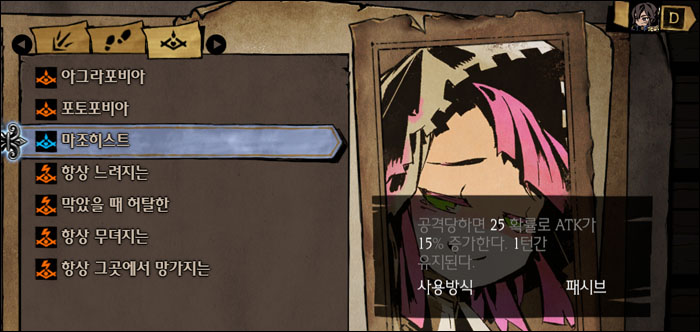 캐릭터의 패시브 스킬. 긍정적 스킬이 1개, 부정적 스킬이 6개이다. 이런 불합리함이 미스트오버의 매력 = 게임조선 촬영