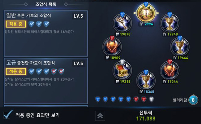 탈리스만은 레어감쇄를 높여서 원샷원킬나는 것을 방지하는 쪽에 초점을 뒀습니다. 조합은 신성한 가호의 조합식으로 레벨5까지 다 올렸으며 개별 탈리스만 옵션의 수치가 낮은지라 표기 전투력은 높게 나오지 않고 있는 상황입니다.