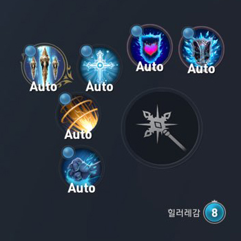 떼쟁 상황에서는 플레임 스트라이크 대신 대신 슈퍼 바이탈리티를 넣고 레어 스킬을 프로즌 아머 + 디펜스 존으로 착용 하고 있습니다.