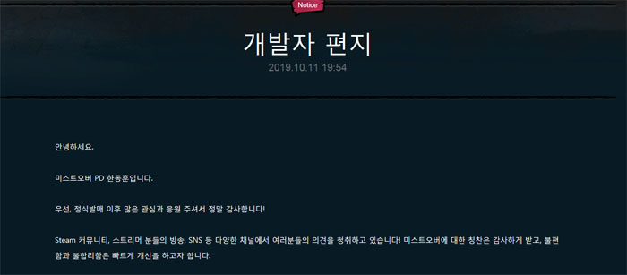 미스트오버는 이렇게 많은 기대 속에서 출시했고, 상당한 기세로 팔려나갔다. 고무적인 것은 한국에 국한된 것이 아니었다는 것. 스팀 기준 '최고 인기 게임' 7위, 닌텐도스위치 '최고 다운로드 순위' 12위까지 올라갔으니 글로벌 기준으로 꽤 많은 판매고를 올린 셈이다.