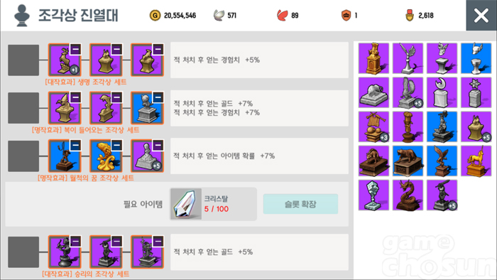 바깥에 진열한 조각상은 대작 상어와 대작 승리의 궁수, 대작 타오르는 태양, 평작 로자임 왕좌 조각상을 쓰고 있습니다. 진열장엔 경험치 및 골드, 아이템 획득 증가를 사용합니다. PK 시엔 같은 경우에는 바깥에다 회피율과 체력을 섞어서 세팅하고, 안에는 HP 30% 버프, 공격력 버프 2개와 공격속도 버프를 사용합니다. 레이드의 경우에는 공격력과 공격속도로 세팅을 합니다.