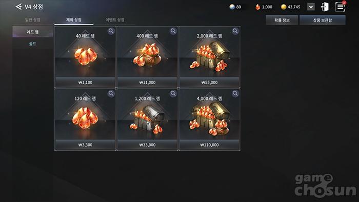 기본 캐시 재화인 '레드 젬'은 계정 귀속이다. = 게임조선 촬영