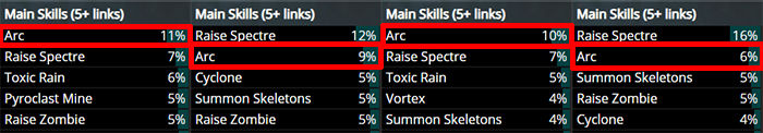 17일 기준 일반 변형 리그 기준 가장 많이 사용하는 스킬은 연쇄 번개로 전체 11%를 차지하고 있다. 그 뒤를 잇는 망령 소환(7%), 맹독성 비(6%)보다 훨씬 선호도가 높은 것을 확인할 수 있다. 솔로모드에서도 미세하게나마 차이는 있지만 연쇄 번개가 10%로 1위를 달리고 있다. 하드코어 모드에서는 생존에 좀 더 중시하기 위해 망령 소환이 12%, 연쇄 번개가 9%, 회오리바람(5%)를 차지하고 있다. 하드코어 솔로 모드 역시 망령 소환이 16%로 선호도가 가장 높으며 연쇄 번개가 6%, 해골 소환이 5%를 차지하고 있다.