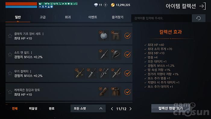 희귀 등급 이상의 장비나 클래스, 아가시온 컬렉션은 다소 힘들더라도, 일반-고급 등급의 장비 컬렉션은 제법 시도해볼 만한 편이다. 고급 이하 등급까지 완료 시 경험치 보너스를 2.5% 얻을 수 있는 만큼 미비하지만 계속해서 쌓이면 큰 차이를 만들어 낼 만큼 유의미한 수치이기도 하다. 경험치 보너스를 제공하는 고급 이하 컬렉션은 강화 수치도 안전 강화 수치 내에서 이뤄지고, 쉽게 구할 수 있는 아이템이 많아 꼭 획득해놓는 것을 추천한다.