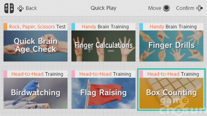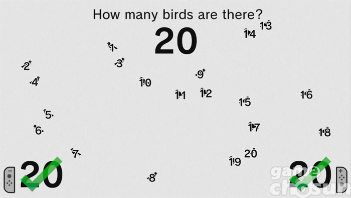 멀티가 가능한 게임은 '새 세기'와 '깃발 들기', '상자 세기' 세 가지다. 새 세기와 상자 세기는 말 그대로 화면에 있는 새와 상자를 세는 것으로 사물의 숫자만큼 ZR 버튼과 ZB 버튼을 누른 후 R 버튼과 L 버튼으로 체크하는 것이다. 깃발 들기는 조이콘의 모션 인식 기능을 활용한 것으로 화면에 나타난 사람의 깃발 동작을 그대로 따라 하는 게임이다. 모든 게임은 끝난 후 걸린 시간과 실수한 동작을 시간으로 환산해 점수를 보여준다.