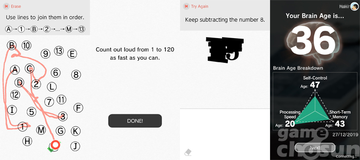 뇌 연령에서 플레이한 게임 외 멀티 게임 세 가지가 마련돼 있다 = 게임조선 촬영