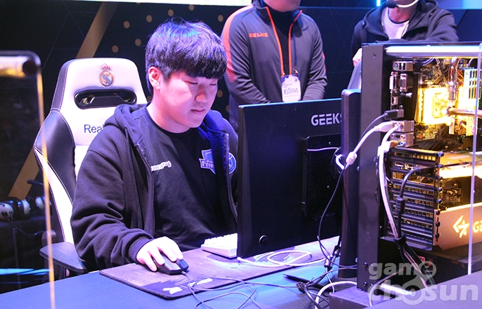 팀이 이기고 있는 상황에서도 승기를 굳히기보다는 경험을 쌓게 한다는 최연성 감독의 콜로 출전하게 된 썬(김태양) 선수 = 게임조선 촬영