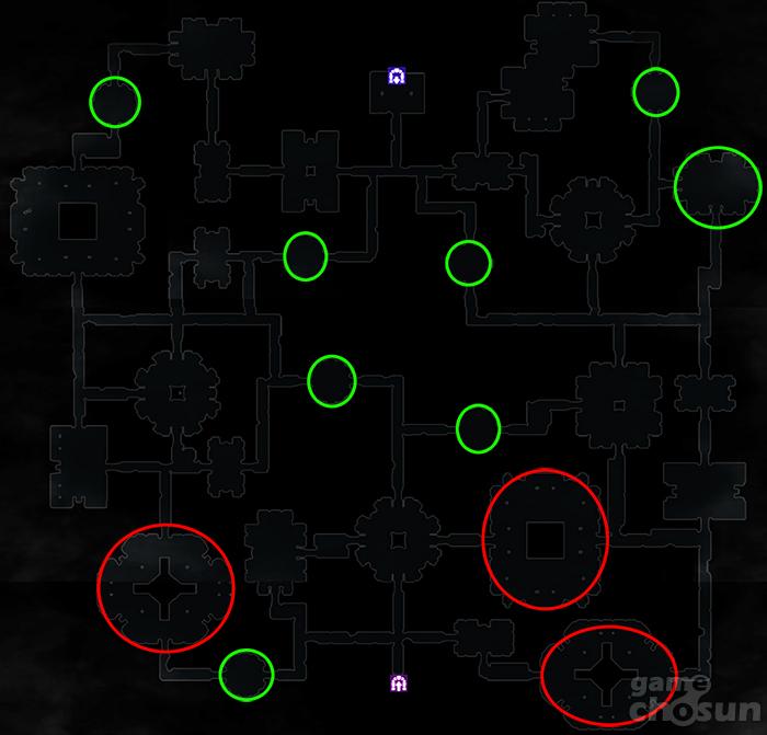 크루마 탑 3층 맵, 녹색 동그라미에서는 불완전한 하거인 파수꾼이, 붉은 동그라미에는 샐러맨더가 등장한다. = 게임조선 촬영