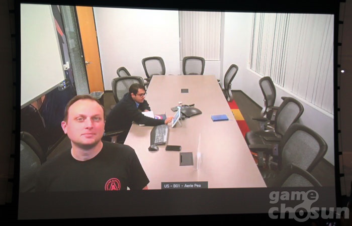 화상 인터뷰를 진행하고 있는 이언 해지코스타스 = 게임조선 촬영