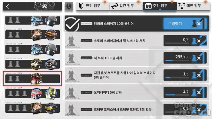 다음으로 '주간 임무'에서는 매주 1회에 한해 합성옥 500개가 주어진다. 총 17개의 임무를 수행하면 되는데, 일간 임무와 목표 형태는 비슷하나, 목표 달성 수치가 훨씬 많다. 따라서 하루만에 완성하는 것은 힘들며, 임무 자체도 주간 내에 해결하면 되므로 느긋하게 하나 하나 클리어하면 된다.