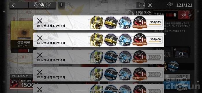 섬멸 작전은 끊임없이 몰려오는 적을 모두 격파하는 콘텐츠인데, 도중에 리타이어하거나 적이 목표 지점을 모두 통과하더라도 처치한 수 만큼 계산돼 합성옥이 지급된다. 따라서 매주 합성옥 획득 리미트까지 꽉꽉 채우는 것이 포인트. 만약 섬멸 작전 : 용문 외곽에서 1회 전투 내 적 400명을 격파하면 매주 최대 1600개의 합성옥을 획득할 수 있는 셈.