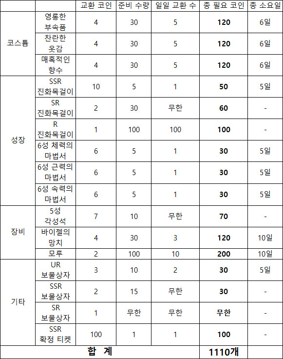 코인은 교환소를 통해 Part.2 SSR 확정 티켓, 바이젤의 망치, 5성 각성석, 코스튬 강화 재료 등을 얻을 수 있다. 각 아이템의 희소 가치를 생각했을 때 되도록 많은 양의 코인을 모아 교환하는 것이 좋다. 참고로 각 아이템은 매일 얻을 수 있는 수가 한정돼 있으니 아래 표를 보고 계획에 따라 교환하자.