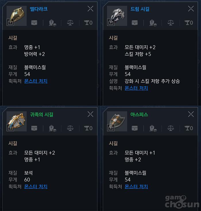 검은 숲에서는 죽음의 회랑에서 드롭되는 국민 시길 '귀족의 시길'을 비롯하여 명중에 좀 더 힘을 실어주는 '아스피스', 희귀 등급 이하 시길 중 유일하게 자체 방어력이 붙어있는 '엘다라크', 강화 시 스킬 저항도 함께 오르는 '드림 시길'이 드롭된다.
