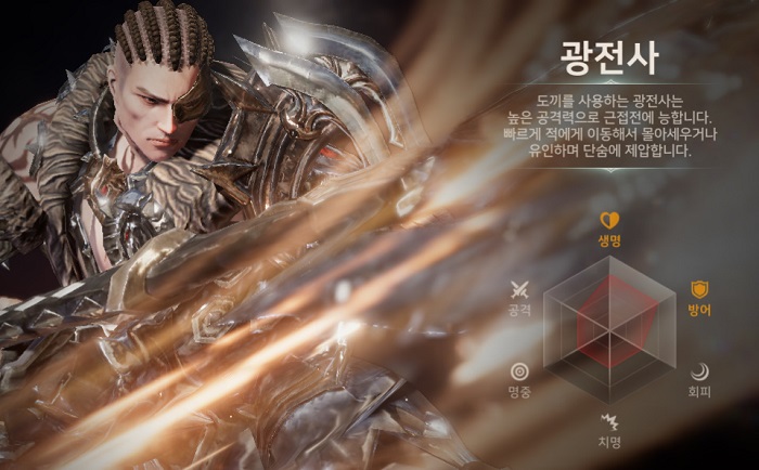 등장하는 5개 클래스는 '광전사', '수호기사', '마법사', '암살자', '궁수'로, MMORPG 장르에서 흔히볼 수 있는 구성이다. 가장 먼저 광전사는 도끼를 사용해 근접전을 펼치는 클래스이며, 수호기사는 망치와 방패로 최전선에서 버티며 전투를 진두지휘한다.