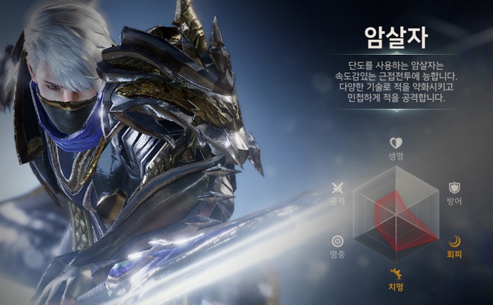 회피와 치명 능력치에 집중된 암살자 클래스는 우리가 흔히 게임에서 접할 수 있는 어쌔신 직업이라고 보면 된다. 은밀하게 적 뒤로 잠입해 요주 인물에게 큰 타격을 입히는 것이 가장 큰 특징. 순식간에 적에게 파고 들어서 연속 공격을 감행하고, 높은 치명타 확률을 바탕으로 크리티컬 데미지를 줄 수 있다.