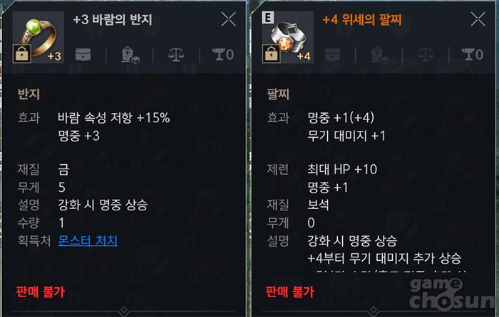 강화로 명중 3이 붙은 반지와, 제련으로 명중 1이 증가한 팔찌 = 게임조선 촬영
