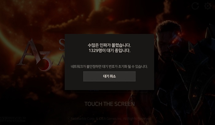 게임 재접속 시에도 많은 게이머가 A3:스틸얼라이브를 찾고 있다는 것을 확인 가능했다. "수많은 인파가 몰렸습니다. 1329명이 대기 중입니다."라는 안내메시지가 생성되며 기나긴 대기열을 만들어냈다. 또, 각 지역마다 등장하는 고대 혹은 전설 등급 몬스터를 공략하기 위해 많은 이용자가 몰려들었고 협력해서 사냥하는 모습을 보여줬다.