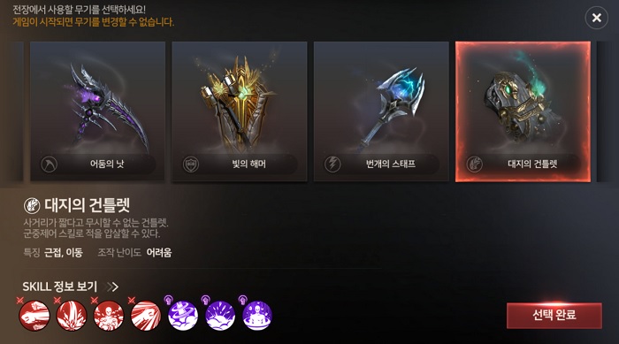 각 무기는 전혀 다른 스킬을 보유하고 있으며 공격의 형태도 다르다. 또, 배틀로얄 내에서 배치하는 스킬도 사용자의 몫임에 따라 오롯이 자신만의 전투 스타일을 구사할 수 있다.