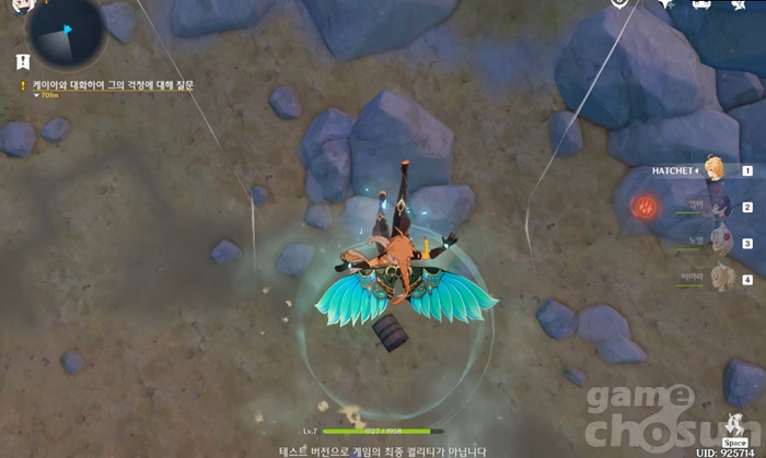 바람의 벽으로 둘러쌓은 오브젝트 취득은 초반에 상승 기류를 단독으로 만들어낼 수 있는 주인공 캐릭터만 가능하다 = 게임조선 촬영