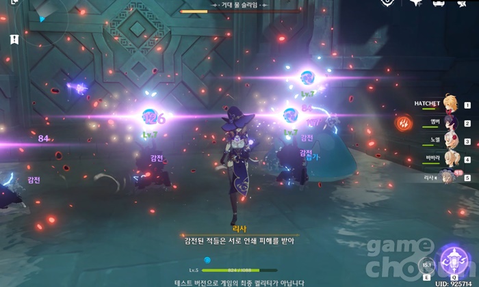 적에게 물 속성 공격을 날려 습기 상태로 만든 후 전기 속성 공격을 가해 단체로 감전시키는 응용도 가능하다 = 게임조선 촬영