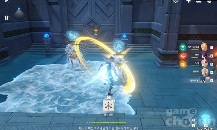 물가에 몸을 담그고 있는 적을 얼음속성으로 공격하면 무력화와 동시에 얼음을 발판삼아 접근전을 강제할 수 있다 = 게임조선 촬영