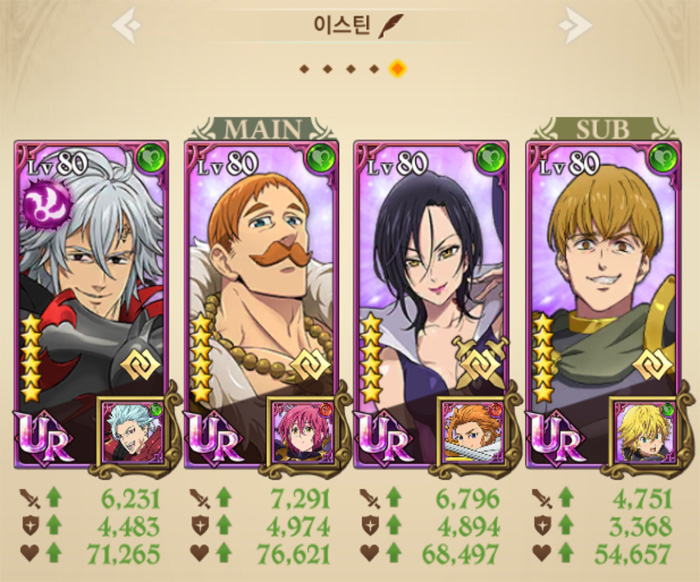 전원 속력 속성이기 때문에 체력 영웅으로 구성하는 것이 좋으며, 이스틴의 또 다른 특성 '공격 시 대상의 필살기 게이지 1칸을 훔친다'가 있어 필살기 (모든 적군에 350% 쐐기)를 상당히 자주 자용한다. 덱의 테마는 아군 필살기는 취소하고, 적은 필살기를 빠르게 모아 날리는 필살기 중심이라는 것이 최대 특징.