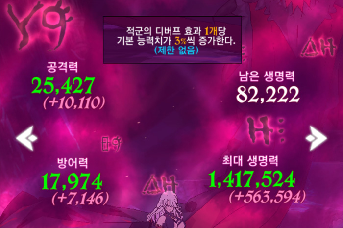 - 적군의 디버프 효과 1개당 기본 능력치 3% 증가