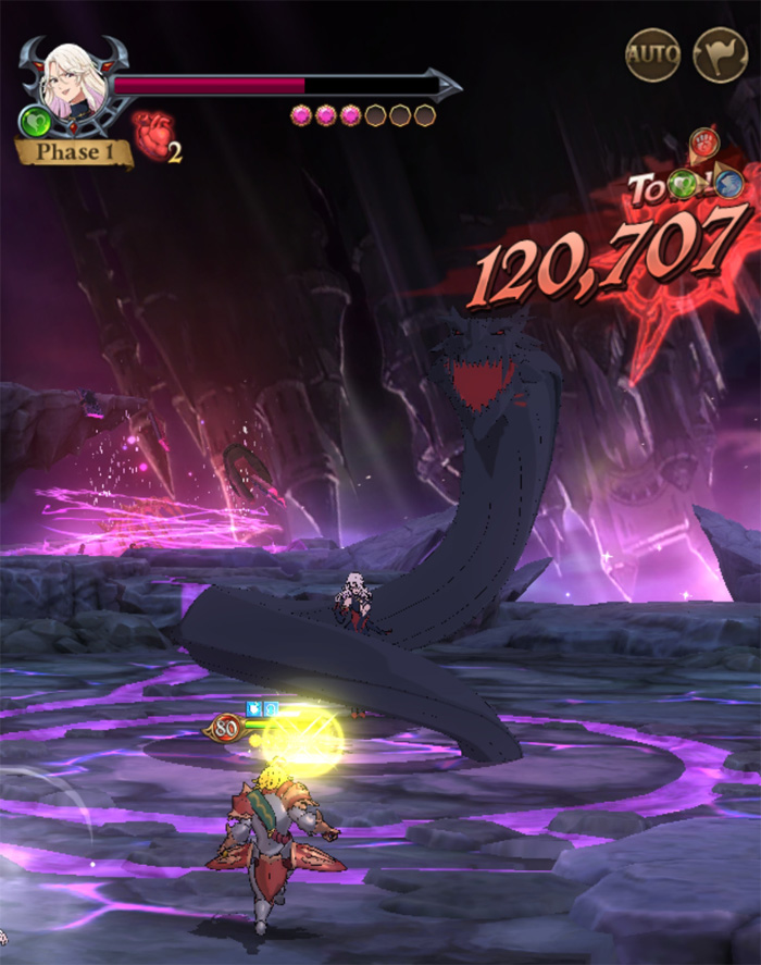 가장 이상적인 공략은 1페이즈에서 다수의 영웅으로 필살기를 모아 2페이즈를 최대한 빠르게 끝내는 것. 만약 딜 부족으로 3턴 이내에 끝내는 것이 어렵다면 자세를 해제할 수 있는 영웅이 반드시 필요하다. 각 속성별로 자신이 가진 자세해제 영웅이 누구인지 파악하는 것이 중요.