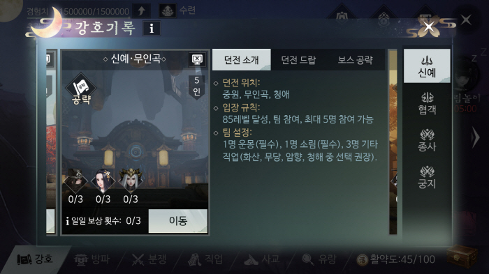 라인콩코리아가 서비스하는 모바일 무협 MMORPG '검은달'의 '무인곡'은 85레벨부터 입장 가능한 고난도 던전으로 80급 장비 '영청소'를 얻을 수 있는 곳이다.