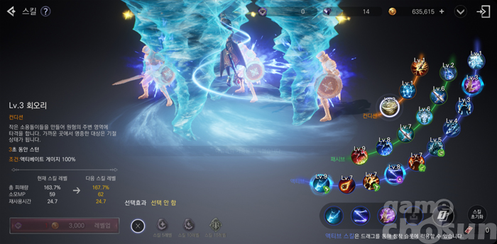 이처럼 일반 스킬은 레벨을 올릴 때마다 강력한 효과를 얻지만, 스킬 포인트가 한정돼 있어 모든 스킬에 효과를 부여할 수 없다. 즉, 필요한 스킬과 효과를 골라 자신만의 스킬 트리를 만들어야 한다. 만약 PVP를 즐기는 이용자라면 큰 효과를 보기 어려운 MP 증가 및 회복 스킬을 과감히 포기하고, 이동 방해 효과에 적극적으로 투자해 결투장 및 필드 전투에서 우위를 점하는 전략이 가능할 것이다.