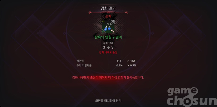 손상이 되면 강화만 안될뿐 사용에는 문제가 없다 = 게임조선 촬영