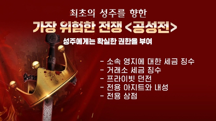 우리가 지향하는 길드 콘텐츠는 실제 군주 시대의 정치, 경제를 게임 내에 구현하고자 하는 것이다. 작은 규모의 길드는 지방의 영지를 소유하고, 중앙 정치 세력인 성주의 정치, 경제적 지배를 받는 형태를 구현하고자 했다. 정식 공성전이 시작되면 영지전과 공성전의 시스템이 연결돼 더욱 재미있는 길드 콘텐츠가 될 것이다.