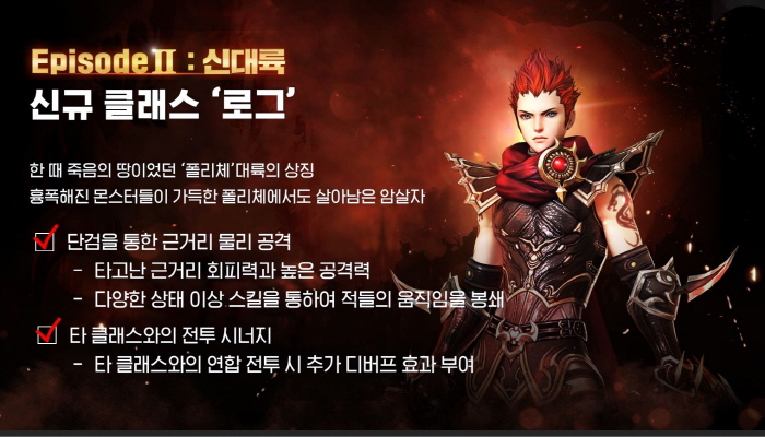 신규 클래스는 원작 '에오스'에서 화려한 공격을 자랑하던 ‘로그’로 '에오스 레드'에서도 로그만의 장점이 부각될 수 있도록 공개될 예정이다. 강력한 몬스터들이 가득한 신규 대륙 ‘폴리체’에서 살아남은 암살자라는 상징적인 의미를 가지고 있다.