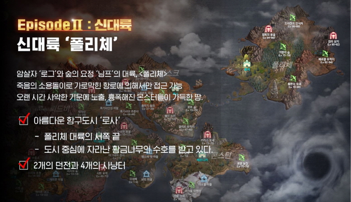 여러가지 업데이트 스펙들이 있으나, 유저들이 가장 크게 기대하는 것은 신규 대륙인 ‘폴리체’와 신규 클래스인 ‘로그’다.