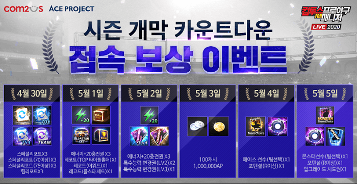 ‘컴프매 LIVE 2020’은 4월 30일부터 5월 5일까지 매일 게임에 접속만 해도 각종 게임 아이템을 증정하는 ‘시즌 개막 기념 카운트다운 접속 보상 이벤트’를 먼저 선보이고, 이어서 매일 주어진 미션을 달성하면 특별한 보상을 획득할 수 있는 ‘달려라! 2020프로야구 이벤트’를 5월 말까지 진행할 예정이다.
