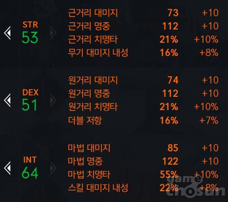 마지막으로 INT에는 스킬 대미지 내성 효과가 추가됐다. 스킬 대미지 내성은 INT 4당 1%를 제공한다. INT가 주스탯인 지팡이와 오브 클래스의 경우 INT 60으로 계산 시 15%의 이득을 얻을 수 있다. 한손검이나 이도류, 단검, 활 클래스 역시 INT가 20 정도 된다는 기준 하에 5%의 스킬 대미지 내성을 얻게 됐다.