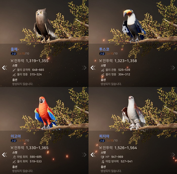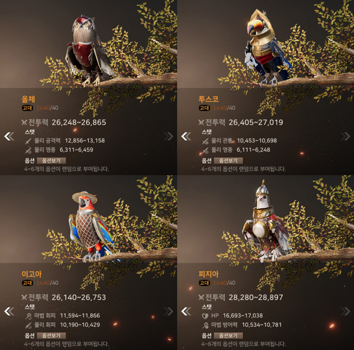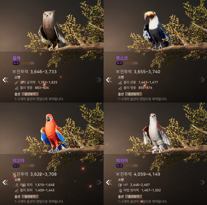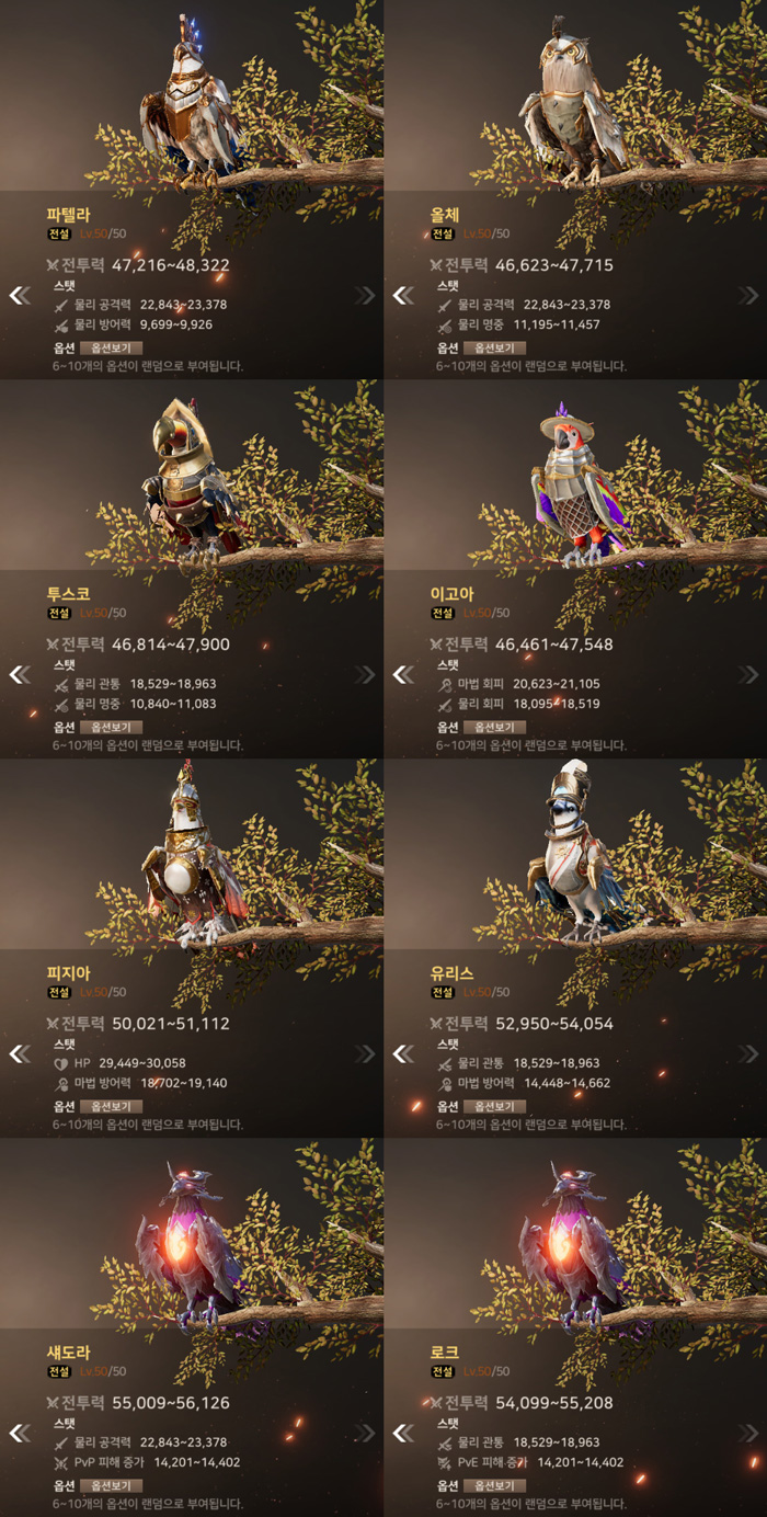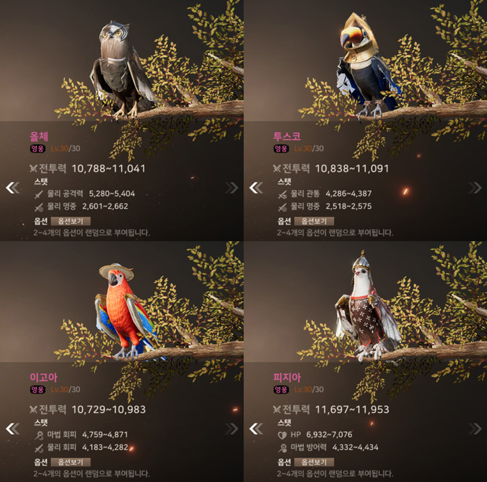 아래는 각 등급별 슈의 최대 레벨 시 능력치 및 옵션 능력치 정보다.