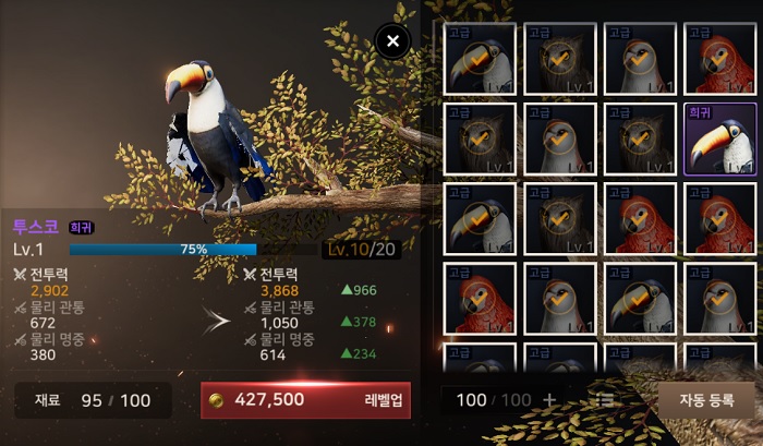 희귀 등급 슈의 레벨업을 위해 고급 등급 슈 95마리를 재료로 투입해보니, 10레벨 정도를 달성했다. 희귀 등급의 최대 레벨이 20이니, 많은 재료를 요구한다는 것을 확인할 수 있다. 게다가 꾸준히 등급을 상승시켜나가야 하고, 등급을 상승시킬 때에는 일정 확률로 상위 등급이 등장하기에 단기간에 육성하는 것은 어렵다.