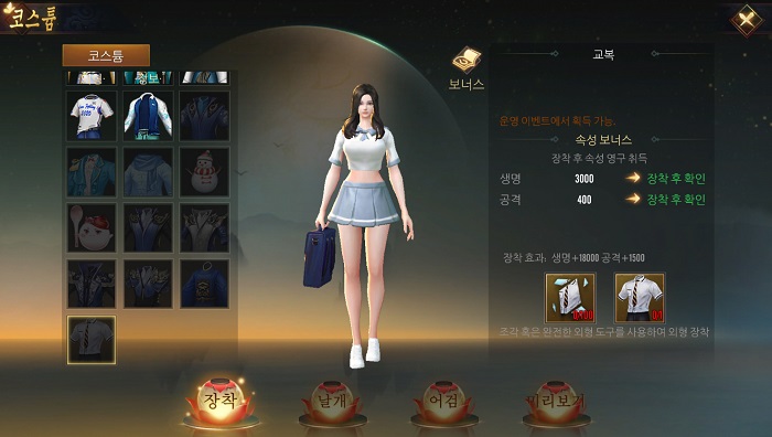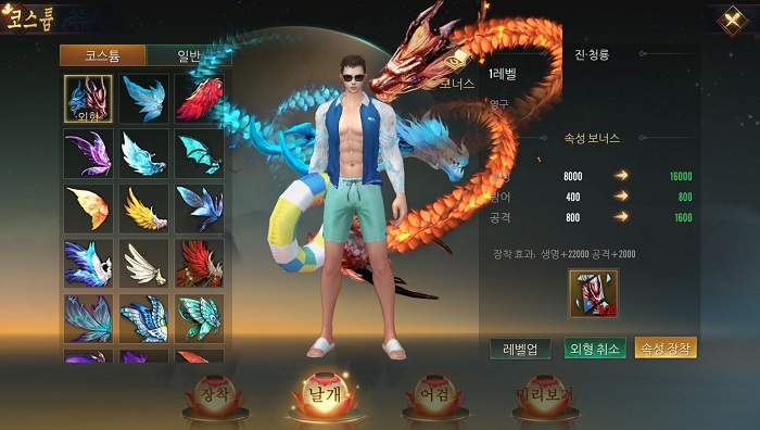 전통과 현대의 시공간을 넘나드는 캐릭터를 가질 수 있는 절호의 찬스, 동서고금을 막론하고 계절과 장소에 따라 맞춰 입는 의상시스템, 태양보다 더 거대한 화려한 날개 코스튬, 바람을 가르는 어검, 수십 가지 코스튬을 모두 손에 넣을 수 있다.