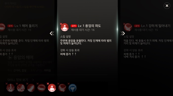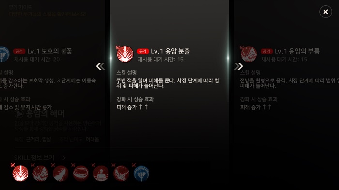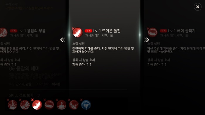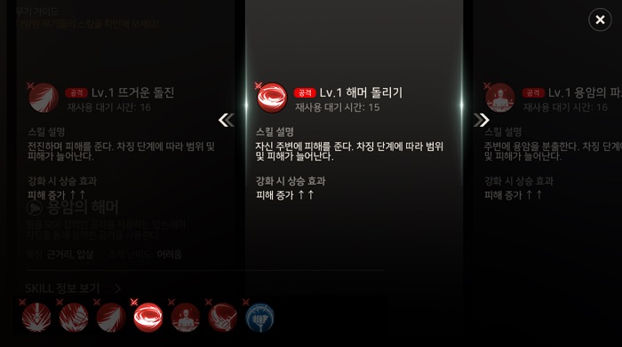 앞서 설명한 것과 같이 용암의 해머는 차징 스킬에 특화된 무기다. 여기서 차징이란, 특정 스킬을 즉시 발동시킬 수 있을 뿐만 아니라 스킬을 즉시 사용하지 않고 누르고 있음에 따라 단계가 상승, 증가한 효과를 낸다.