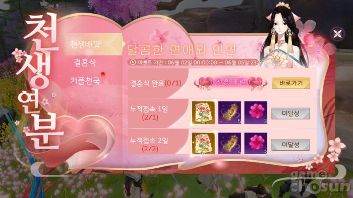 이벤트 달성 조건은 간단하다. 천생배필은 결혼식 완료와 이벤트 기간인 3일 동안 접속하면 된다. 결혼식은 일반 결혼식, 혹은 호화 결혼식 진행과 혼수 선물을 하는 것으로 완료되며, 커플천국은 이벤트 기간 동안 결혼식이 10회 진행되면 달성된다.