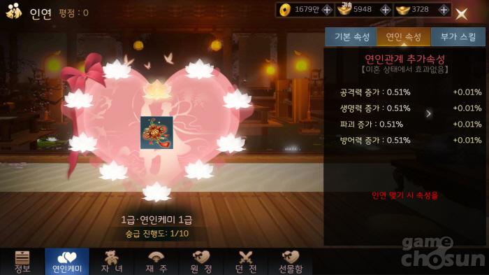 해당 수치를 올리기 위해선 '인연괘'와 '장미 9송이', '장미 99송이' 등 소모 아이템이 필요하다 이 아이템들은 인연 던전 및 상점, 이벤트로 획득할 수 있다.