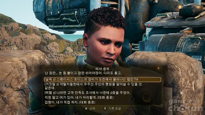 일반적인 RPG가 큰 틀에서의 선택지로 이루어져 있다면, 아우터 월드는 폴아웃 개발진이 만든 게임답게 NPC와의 별거 아닌 대화 역시 계속된 선택의 연속이다. 자신의 능력치에 따라 NPC에게 조언을 할 수도 있고, 설득, 거짓말, 위협 등 다양한 방식으로 대화를 이끌어나갈 수도 있다. 경우에 따라서는 답변에 따라 NPC와 전투를 벌여 죽이고 새로운 루트를 만드는 등 대화를 통한 변화가 극단적이다.